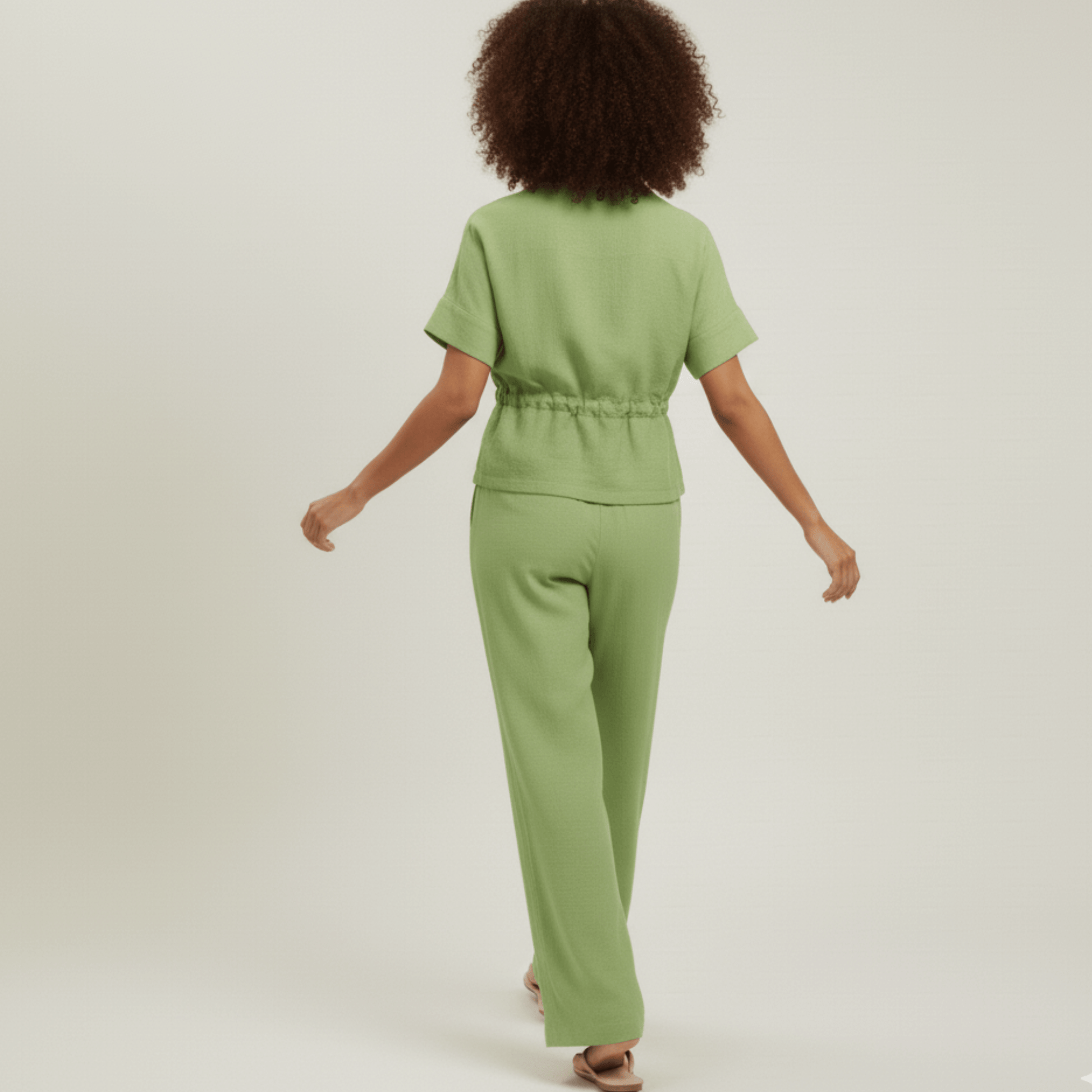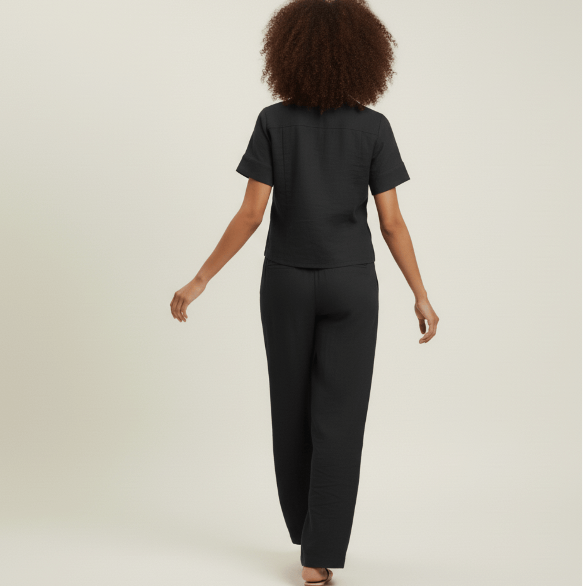 The matching wide-leg pants are designed with a relaxed fit and an elasticated waistband making them as comfortable as they are flattering. The lightweight, breathable fabric ensures all-day wearability, whether you’re lounging at home, running errands, or stepping out for a casual outing.