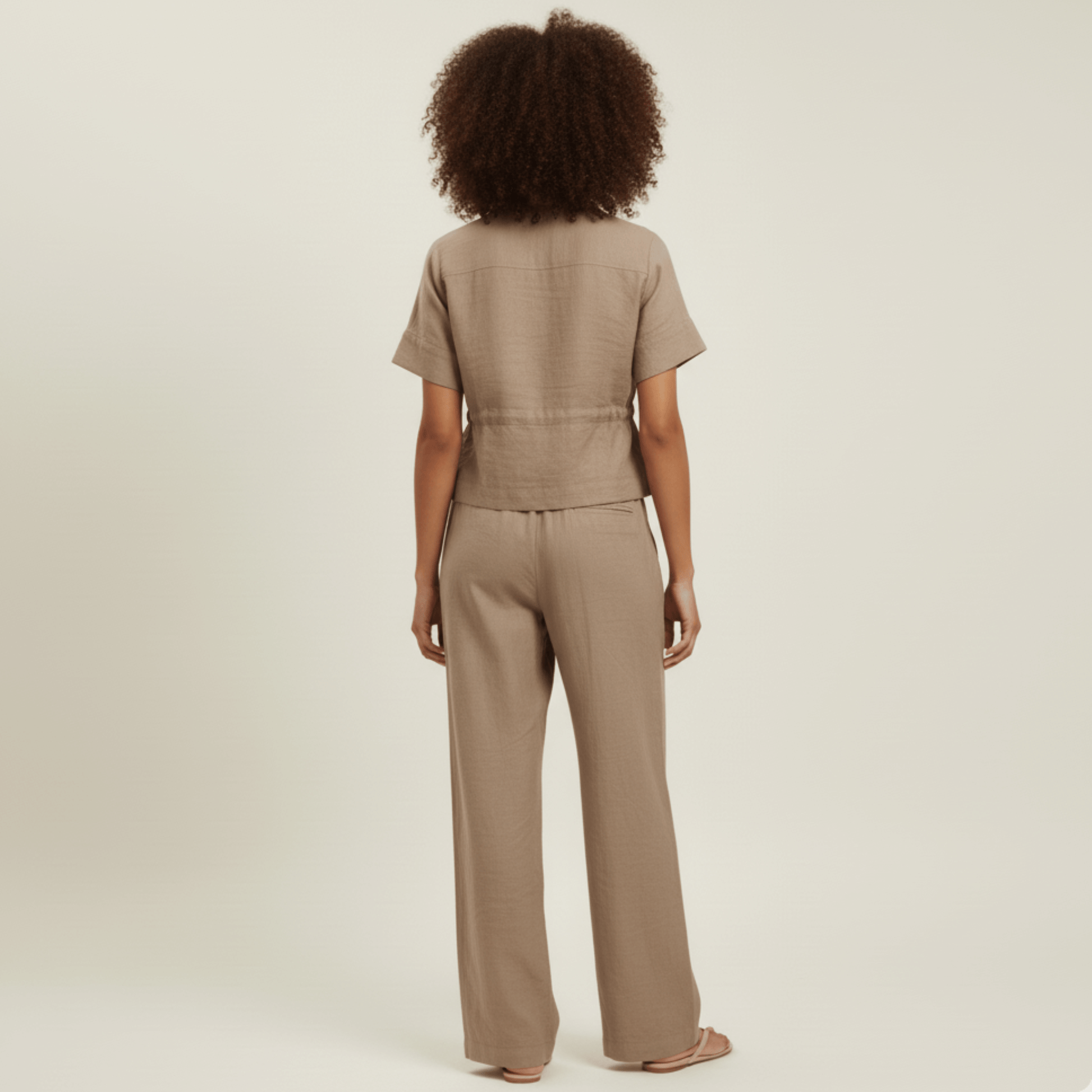 - Two-piece lounge set: collared drawstring top and wide-leg pants