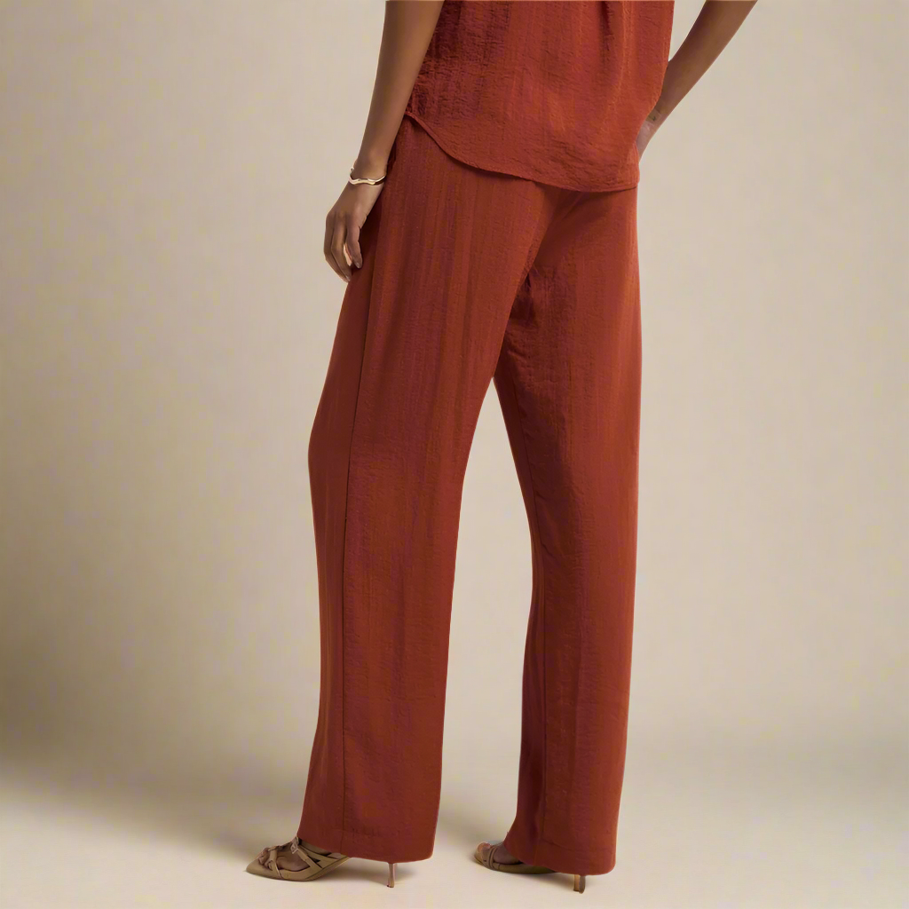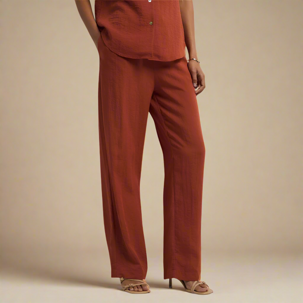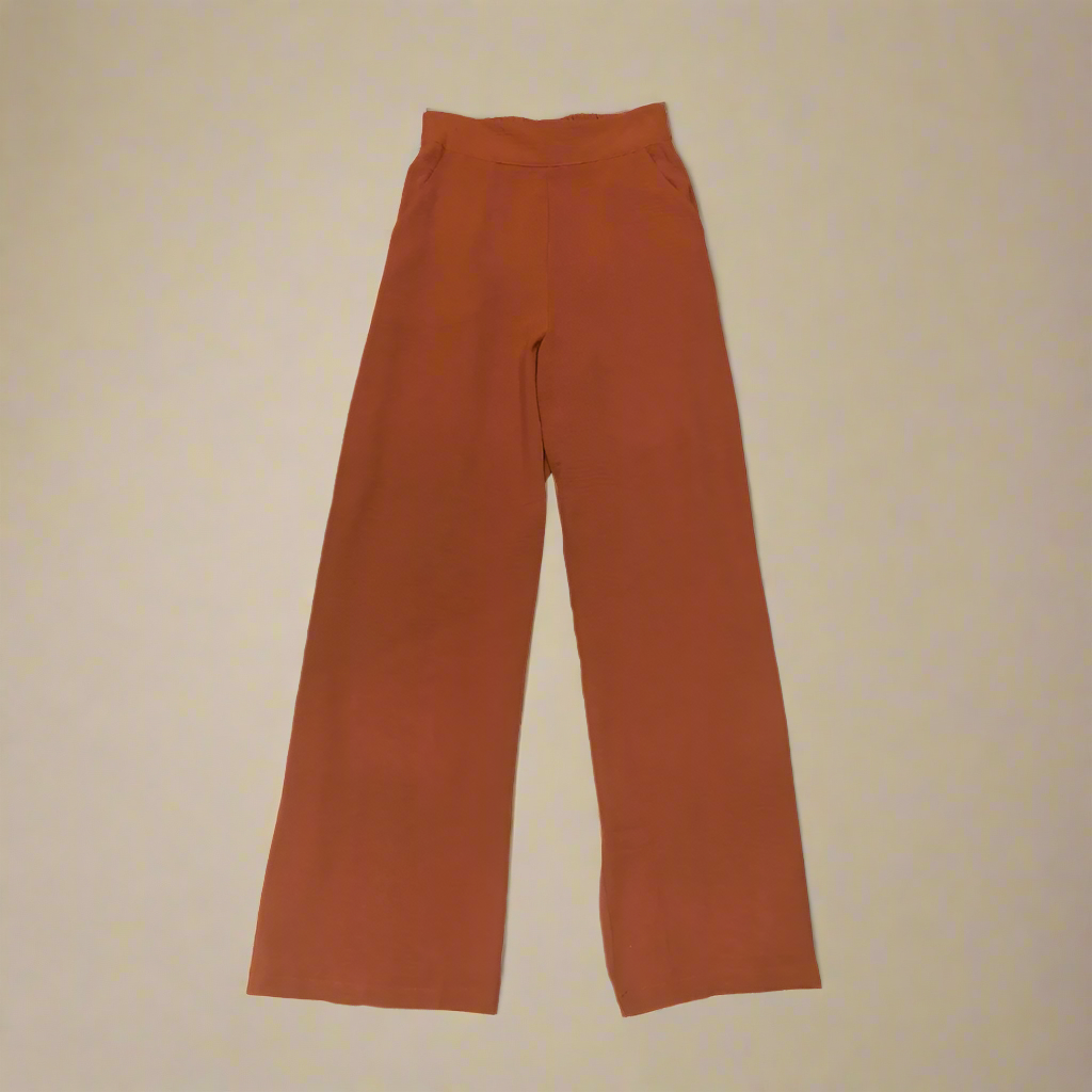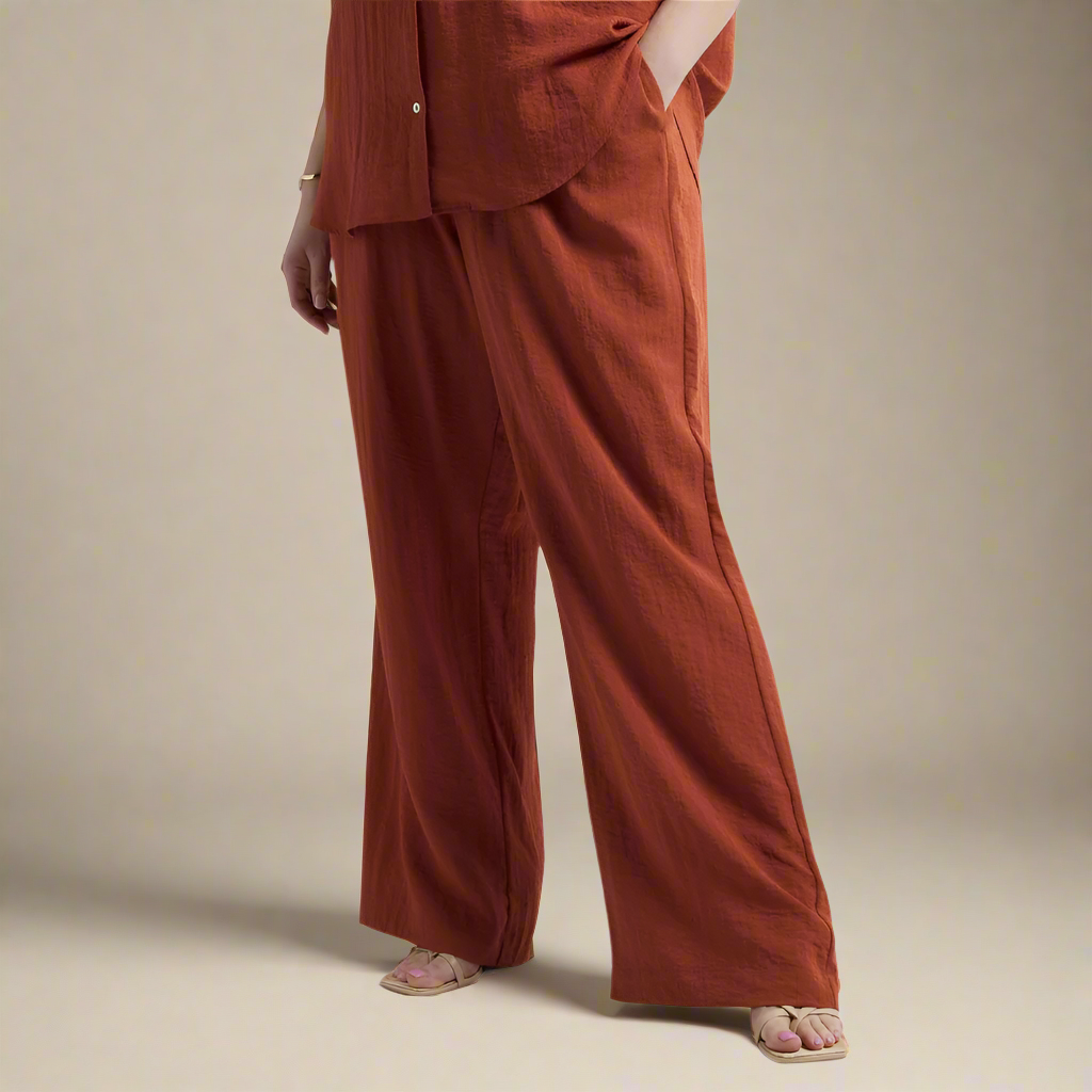 Upgrade your wardrobe with our Urban Luxe Rust Wide-Leg Pants. These stylish pants offer a comfortable and casual fit, featuring a semi-elasticated waistband for added comfort. The rust color adds a touch of boldness to your outfit. Perfect for any occasion.