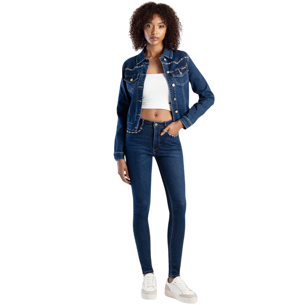 - Eye-catching embellishments: Embellished studs on both the front and back pockets create an edgy and eye-catching look.